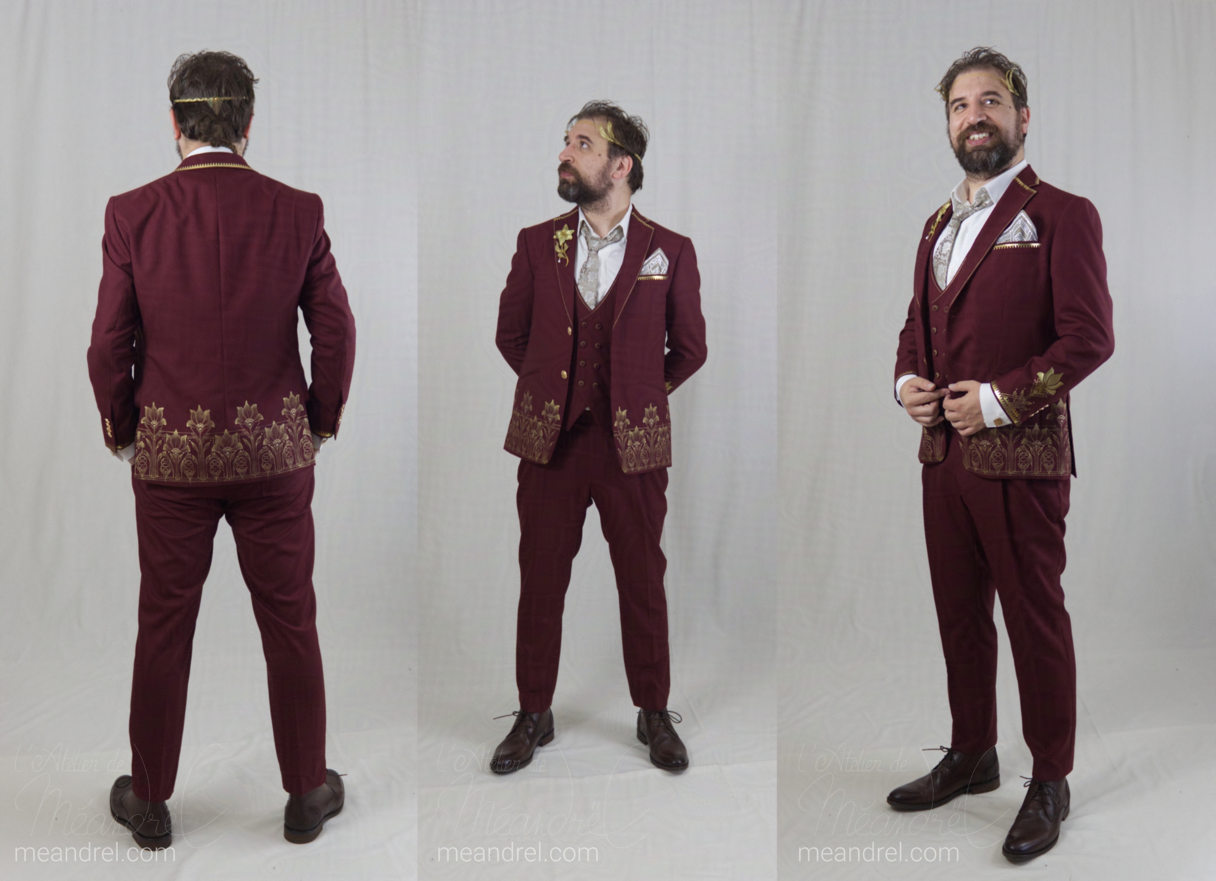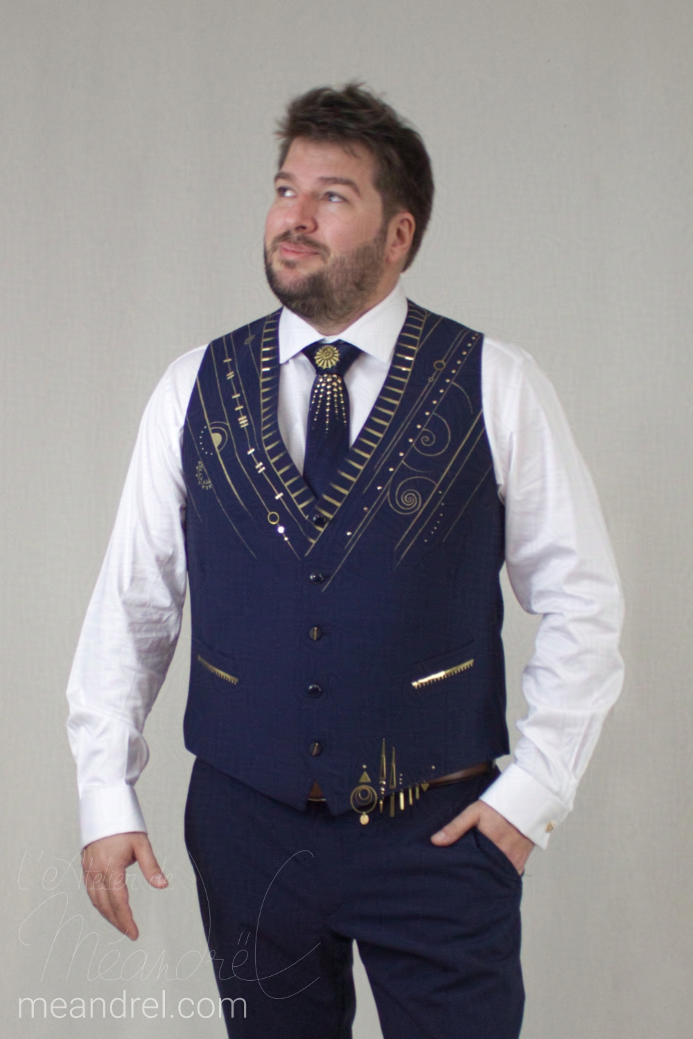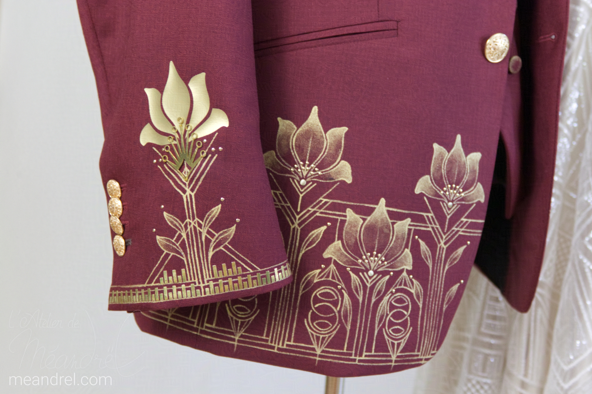 En parlant de « veste de costume pour un mariage à thème » : ici peinture, éléments métalliques , accessoires : en avant pour les années 20 !